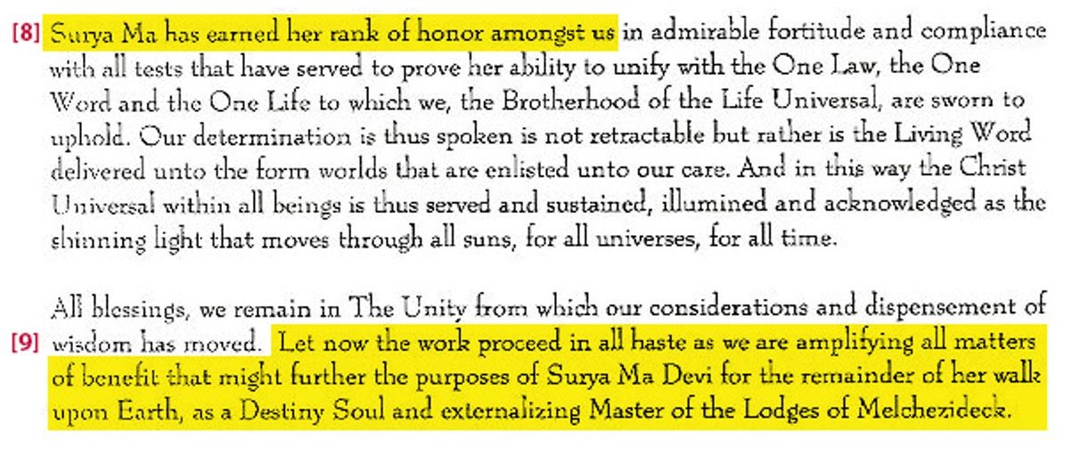 [1.] ‘Response to the call by Master Surya Devi for Review.’ Since declaring herself an Ascended Master in 1991, Patton West has awarded herself ever more ridiculous titles and accolades including ‘Regent of the Rishis’ and ‘Planetary Guardian’ and ‘Regent of the Spiritual Hierarchy of the Western Hemisphere.’ Lately, she has announced herself to be a ‘Blessing to all Souls’ and an ‘Instrument of Mercy’ able to deliver the phenomena of ‘Divine Grace Healings’ and ‘Dispensation of Karma.’ All for a large six figure sum for which the pay portal on her website is set up to receive. Patton West is a psychotic with huge delusions of grandeur. The personalities she creates (and forces others to accept as real) are all in her head.